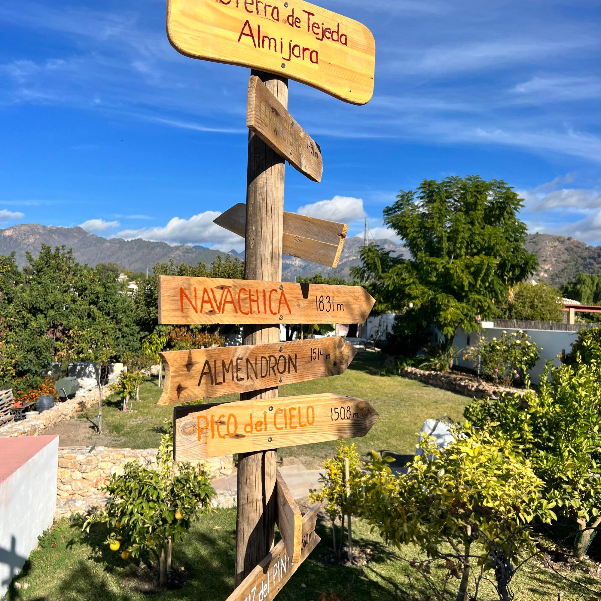 Bergen tonar upp sig bakom Casa Larwik där vi kommer tillbringa åtta välgörande dagar. Skylten står på tomt och pekar mot de magiska bergen som vi kommer möta under veckan.