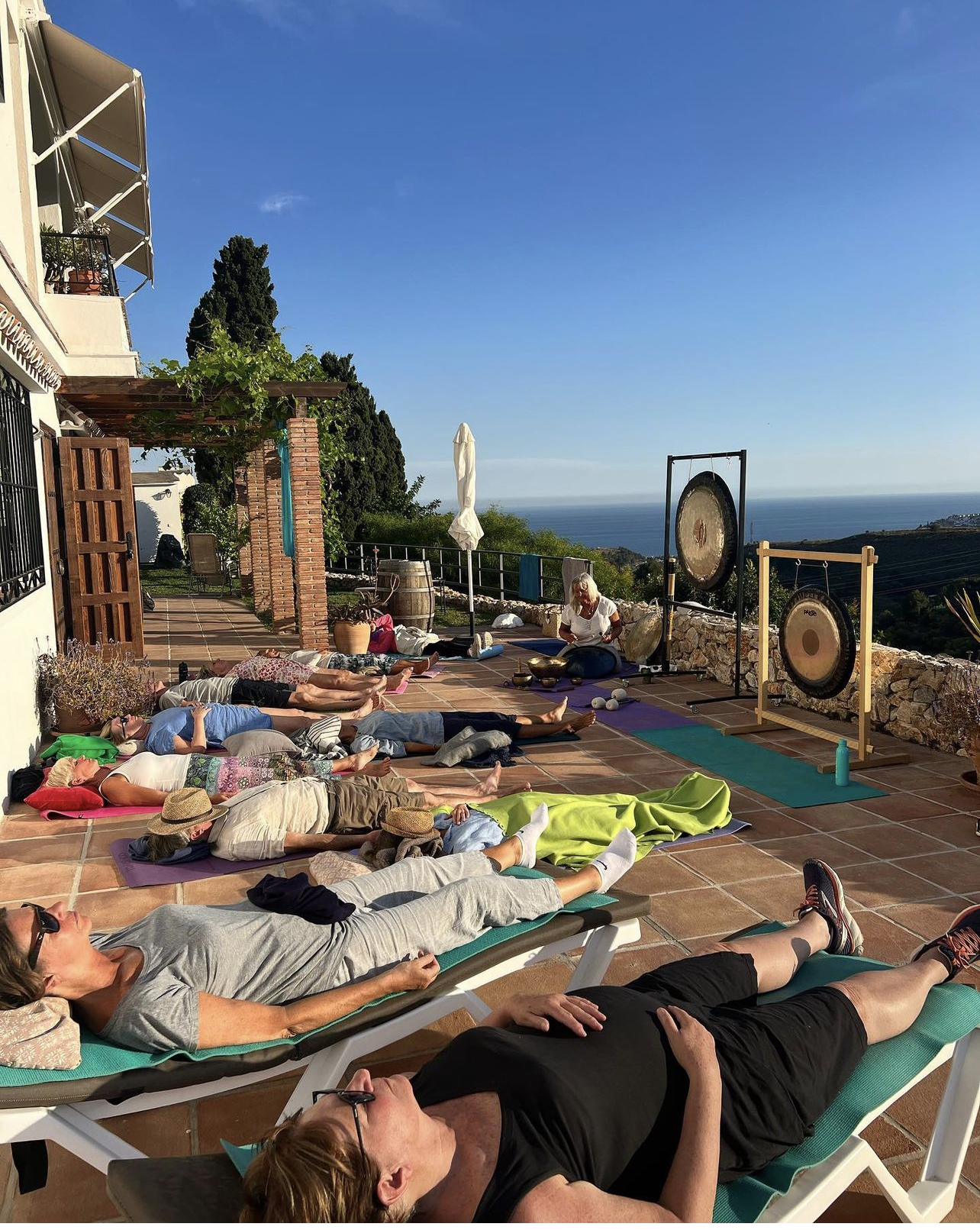 Jag bjuder på ljuvlig, återhämtande och energivande yoga på terrassen med utsikt över havet. Tre yogaformervarvat med vandring. Före frukost andningsträningar vi, gör lugn MediYoga som aktiverar läkning och boostar lymfsystemet, och avslutar med meditation. Efter vandring eller en dag på stranden landar vi i Yinyoga, stretchar och mjukar upp bindväven och fördjupar närvaron i mindfulness, eller bara djupavslappnar i Yoganidra ”yogisk sömn”. Det händer att vi yogar på stranden. Ingrid spelar också gong- och klangbad för oss ibland.